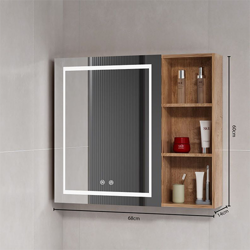 Mueble Botiquin LED para baño. Incluye Espejo con LED y Antiempañante. Color: Wood. Medidas: Largo 68cm, Profundidad 14cm, Alto 80cm